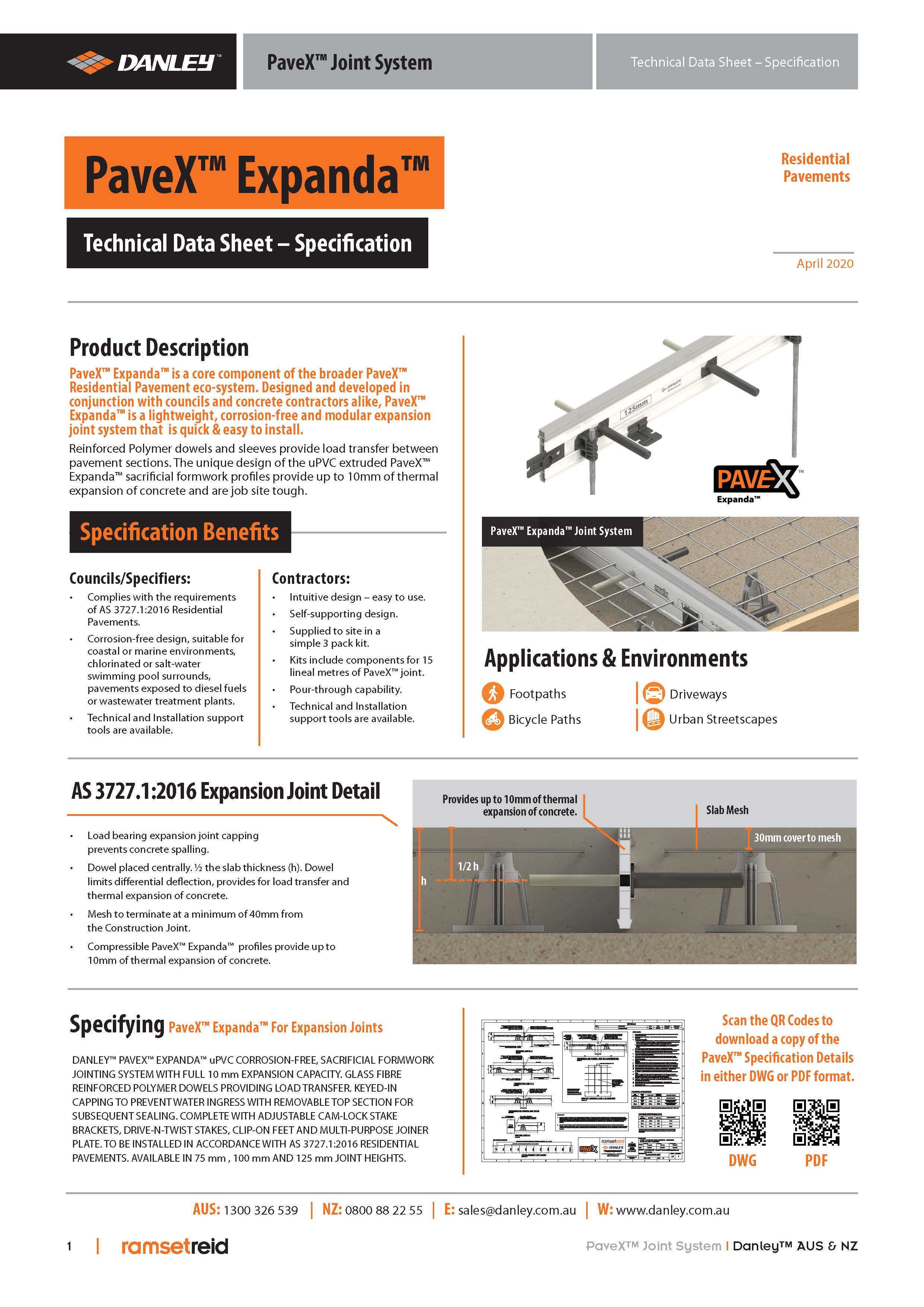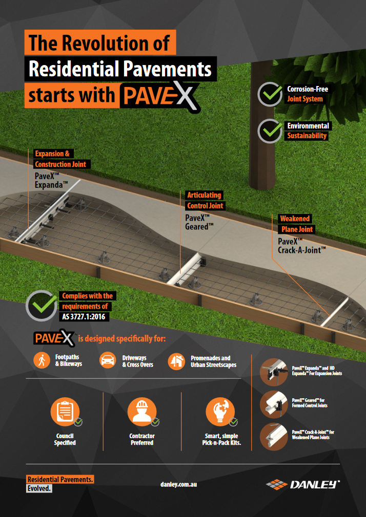 | Danley PaveX Eco-system Product Guide ANZ | Product Guides | Designed and developed in conjunction with councils and concrete contractors alike, PaveX™ systems iare lightweight, corrosion-free and modular expansion joint systems that is quick & easy to install. |