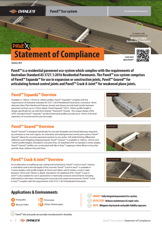 | Danley PaveX Eco-system Statement of Compliance | Product Bulletins | PaveX™ is a residential pavement eco-system which complies with the requirements of Australian Standard AS 3727.1:2016 Residential Pavements. The PaveX™ eco-system comprises of PaveX™ Expanda™ for use in expansion or construction joints, PaveX™ |